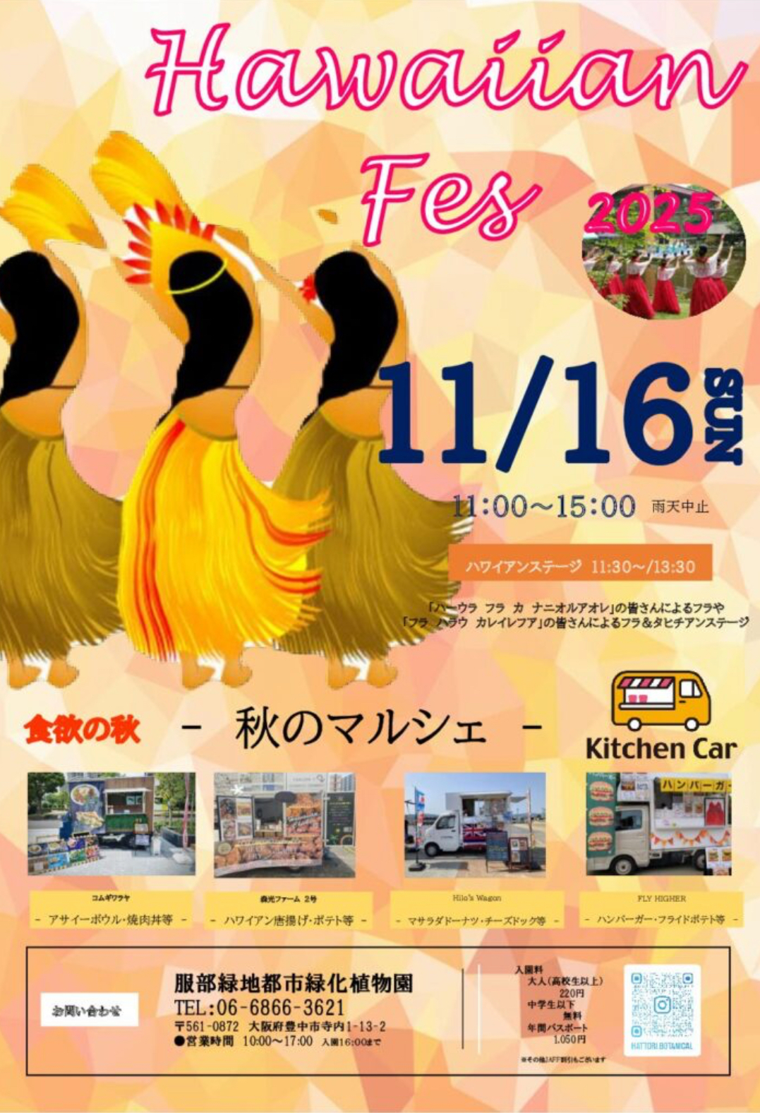 ハワイアンフェス2025 in 服部緑地 出演 2025年11月1日 by wpmaster. イベント詳細 日付: 2025年11月16日 13:30 – 14:30 会場: 服部緑地都市緑化植物園 カテゴリ: イベント 服部緑地植物園で開催される「ハワイアンフェス2025」に出演いたします。 私たちの出演は第1部 11:30〜です。 皆様この機会にぜひ足をお運びください♫ 【日時】11月16日(日) 演奏観覧無料(別途入園料が必要) 【演奏時間】11:30~/13:30〜 キッチンカーの出店もあります。